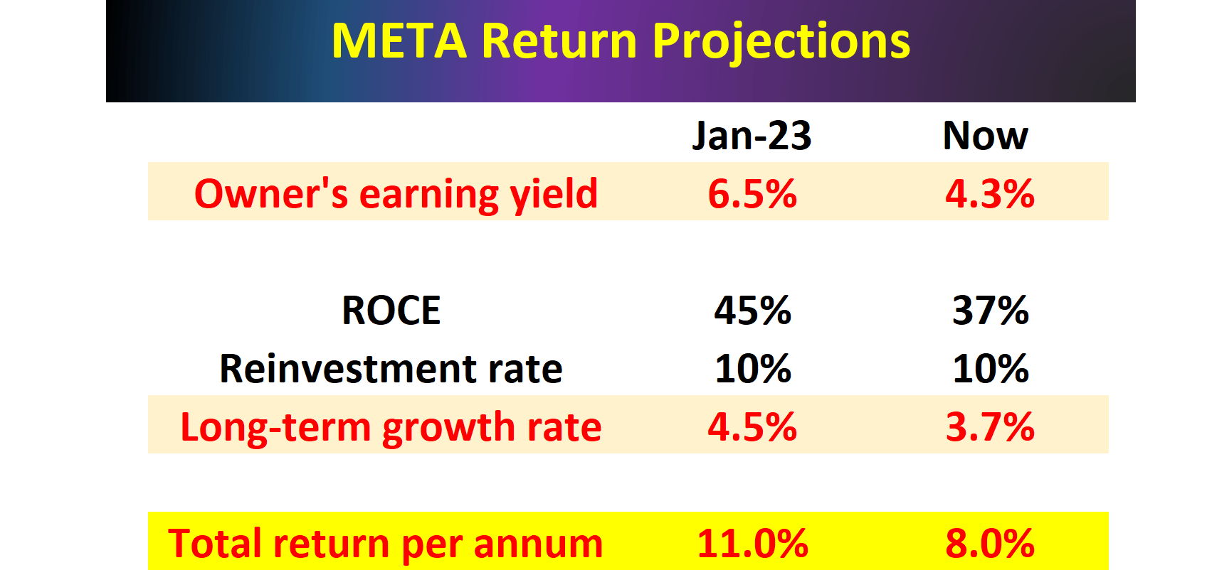 The next table shows my projected growth for META and the long-term return potential based on the above framework. Its RR was taken to be 10% based on my analysis of its growth CAPEX in the past 12 months. With an ROCE of 37% and an RR of 10%, it could maintain a 3.7% organic growth rate (i.e., real growth rate). At its current P/E multiples (around 23x, if you recall from the chart in Section 1), META offers an owner’s earnings yield (“OEY”) of around 4.3%. Hence, the total annual return potential adds up to about 8%. In comparison, its return potential at the beginning of 2023 is in the double-digit, when its P/E was much lower and ROCE much higher (around 11%). With an 11% return potential, I see very favorable odds for market-beating performance (which it has indeed delivered). But with the current 8% expected return, the odds are much worse now.