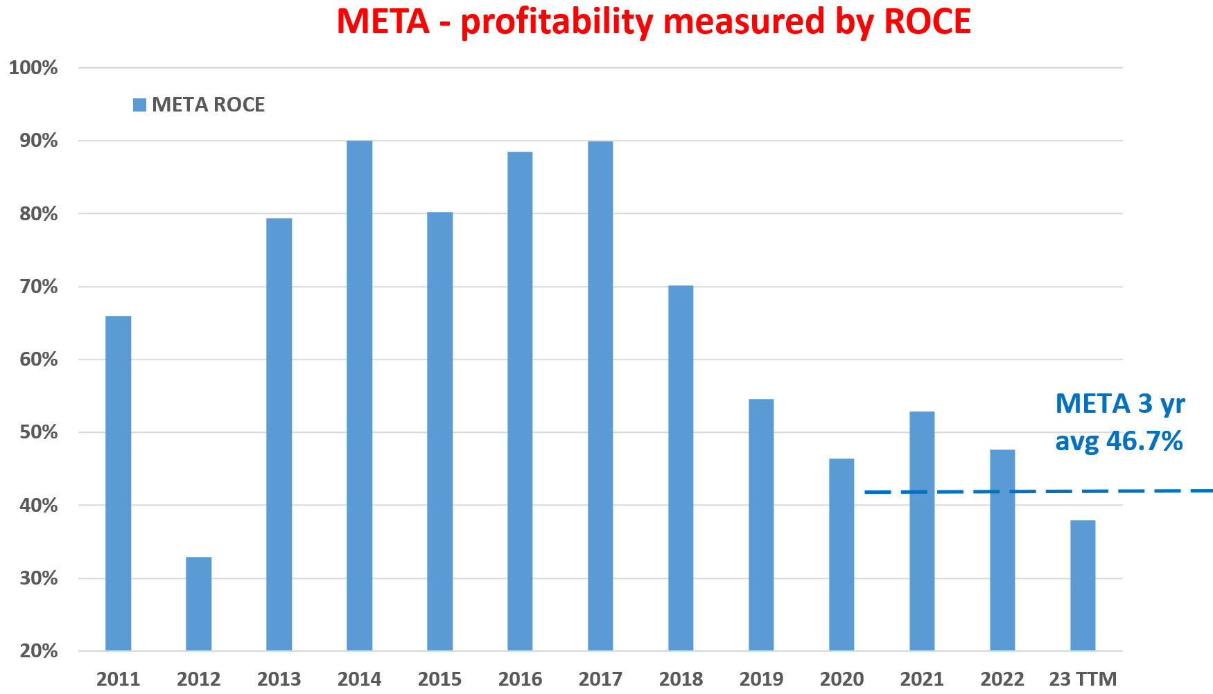 The above profitability headwinds are also reflected in its ROCE (return on capital employed), the most important profitability metric in our view. For readers new to the concept, my earlier article has detailed discussions on the importance of ROCE and its differences compared to other profitability metrics such as ROIC and ROE. As seen in the next chart below, META’s ROCE has averaged around 46.7% in the past 3 years. And its current ROCE hovers around 37%, far below the 3-year average due to the challenges mentioned above.