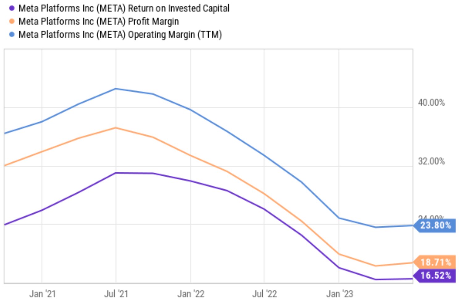 In addition to the above uncertainties, META has also been facing some profitability pressure recently. As seen in the chart below, its profitability metrics have been in retreat across the board in the past 1~2 years. All major metrics such as ROIC (return on invested capital), operating margin, and profitability margin have declined by a factor of about 2x since their peak values in July 2021. To wit, its ROIC declined from a peak value of 42% in July 2021 to the current level of 24%. And operating margin declined by a similar degree, from a peak value of 37% in July 2021 to the current level of ~19%.