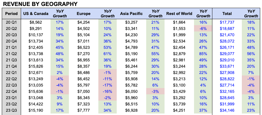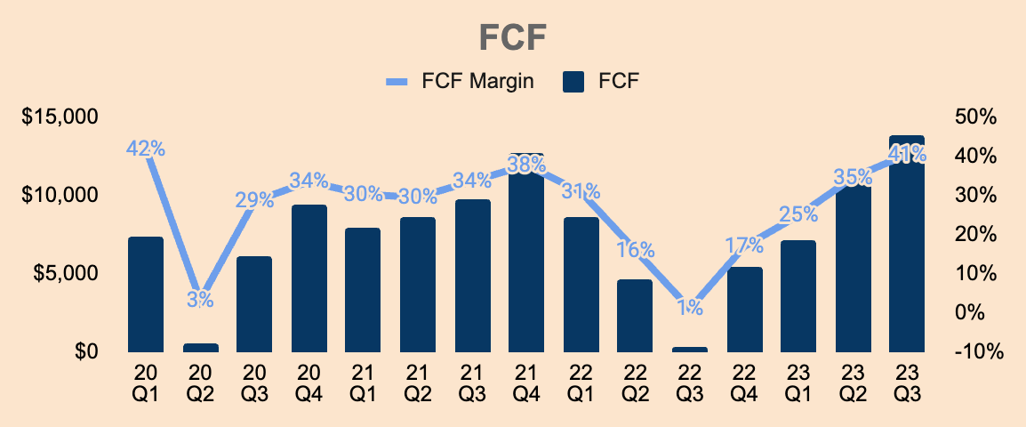 Q3 Free Cash Flow was $13.9B, which is a 41% FCF Margin, due to strong growth and improved profitability. Q3 FCF also benefited from a deferral of income taxes to Q4, so expect FCF Margins to dip slightly in Q4.