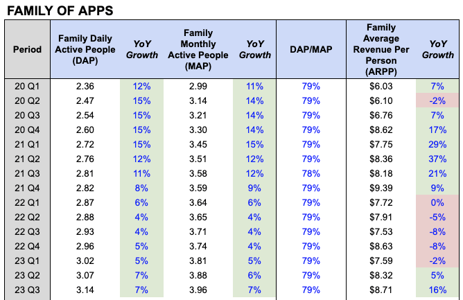 That being said, Meta’s expanding user base also contributed to the company’s overall growth. In Q3, both Family Daily Active People and Family Monthly Active People were up 7% YoY to 3.14B and 3.96B, respectively.