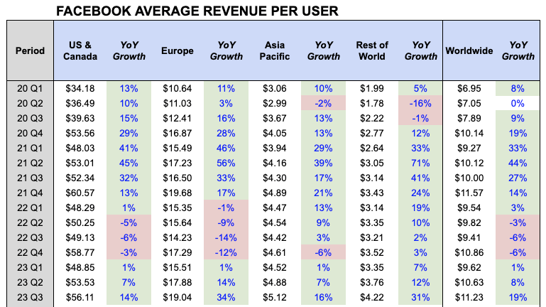 Looking at Facebook Average Revenue Per User can also give us a clue as to which region is driving the most growth and which region has the largest potential for growth.