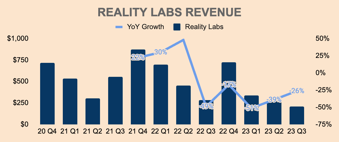 On the other hand, Q3 Reality Labs Revenue was down 39% YoY to just $210M due to lower Quest 2 sales volume. This is expected since a lot of people were waiting on the Quest 3, which hit shelves in October. As such, we should see RL Revenue pick up over the next few quarters.