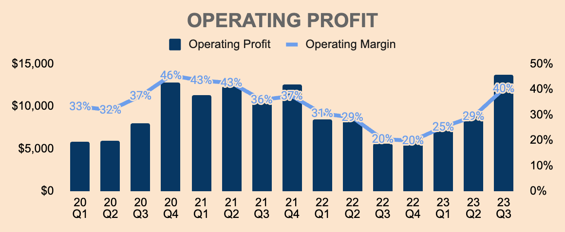 - FY2023 Total Expenses of $87B to $89B, lowered from their prior range of $88B to $91B. In the first three quarters, Total Expenses was $64.4B. Taking the midpoint guidance of $88B for the full year, we get Q4 Total Expenses of around $23.6B. Assuming Q4 Revenue of $38.25B (midpoint), Q4 Operating Margin is expected to be about 38%, which is a slight dip from Q3’s 40%. Nothing to panic about since it’s a vast improvement from last year.