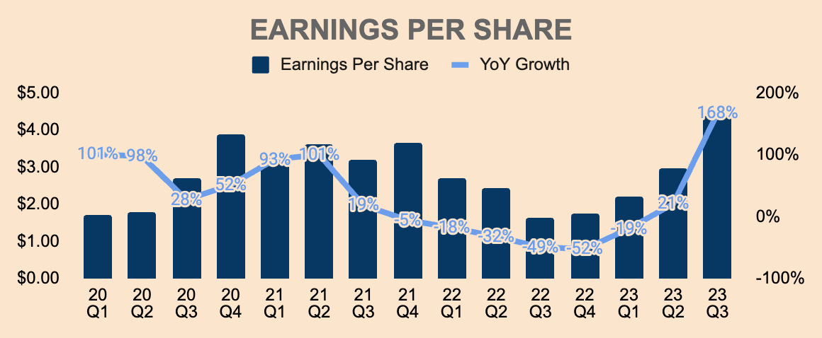 Jumping to the bottom line, Q3 Net Income was $11.6B, which is a 34% Net Margin. On a per-share basis, Q3 GAAP EPS was $4.39, growing by an astounding 168% YoY. This beat analyst estimates by $0.76, or 22%!