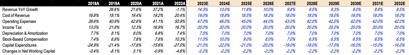 - CapEx: Follows management’s guidance of $27B to $29B for FY2023 and $30B to $35B for FY2024. I expect CapEx to remain high over the next few years but will drop gradually as a % of Revenue.
