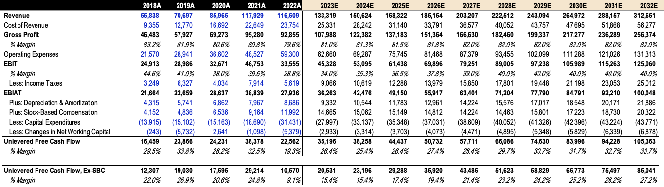 - Total Expenses: Follows management’s guidance of $87B to $89B for FY2023 and $94B to $99B for FY2024. Additionally, I expect Operating Margin to improve from 34% this year, to 40% in the long term.