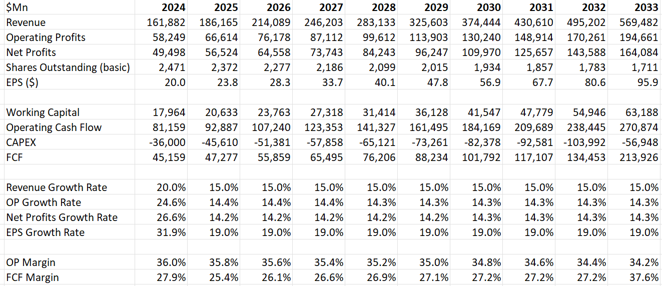 For instance, Meta’s depreciation costs as a percentage of revenue rose from 4.2% in FY18 to 6.3% in FY23. The company anticipates a significant CAPEX increase in FY25, which will likely continue to create margin pressure in the near future. On the positive side, Meta’s restructuring costs have started to normalize in recent quarters. Consequently, I project Meta will improve its gross margin by 10bps, driven by growth in business associated with its AI models. I calculate that their depreciation costs will grow by more than 20% in the future, resulting in a 30bps margin pressure. As such, I project a 20bps margin contraction in the model. As a result, I anticipate Meta’s operating margin to decline to 34.2% by FY33.