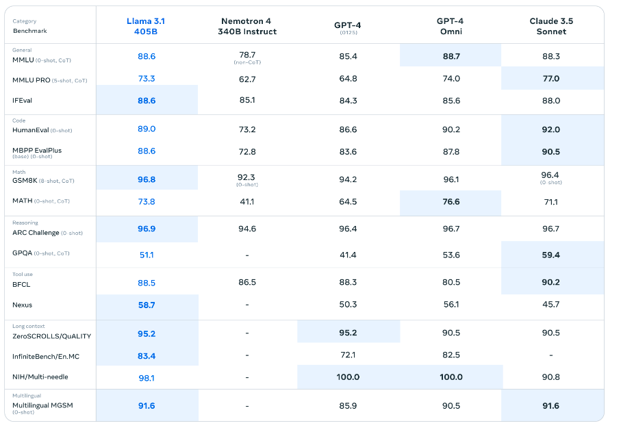 In July 2024, Meta introduced their Llama 3.1 405B, a leading openly available AI foundation model. As shown in the table below, Meta’s internal evaluation suggests that the Llama 3.1 405B model is competitive with leading foundation models including GPT-4, GPT-4o, and Claude 3.5 Sonnet.