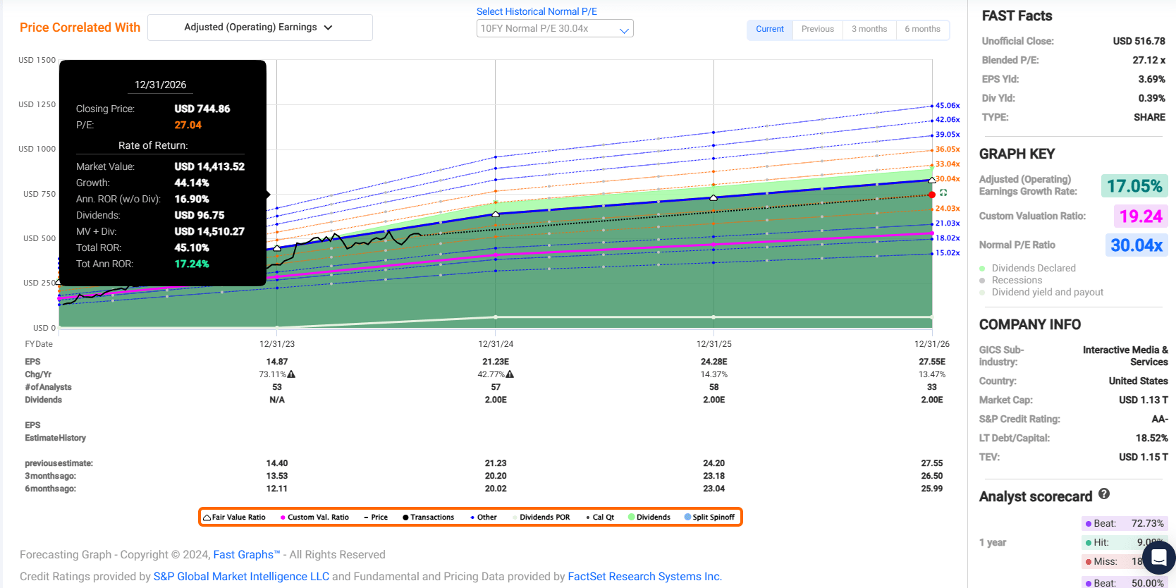 That’s why beyond the 42.8% surge in diluted EPS to $21.23 that’s anticipated in 2024, the future is encouraging. Meta’s diluted EPS is expected to rise by another 14.4% in 2025 to $24.28 per FAST Graphs. The analyst consensus for 2026 is for an additional 13.5% growth in diluted EPS to $27.55.