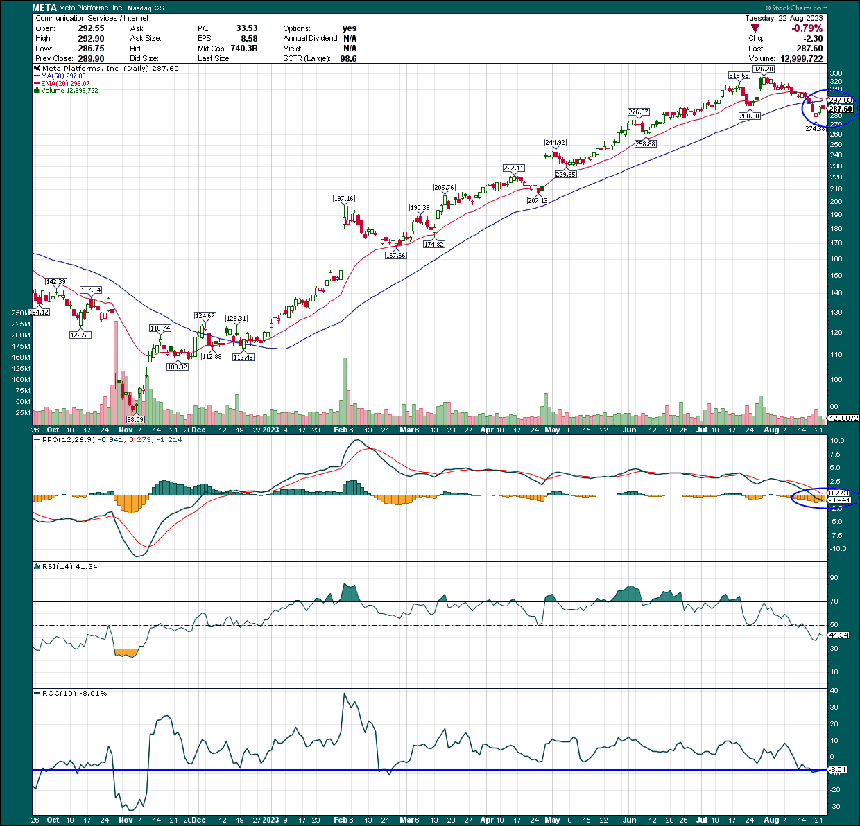 The stock bounced right off of the rising 20-week exponential moving average last week and has moved higher. The 14-week RSI was extremely overbought but is now at just 60. The PPO was also extremely overbought and still is to an extent, but that’s what happens during strong uptrends. Finally, the 10-week rate of change is now flat. In other words, the stock is right where it was 10 weeks ago; I can’t be bearish when a strong leader like Meta is trading where it was 10 weeks ago during a bull market.