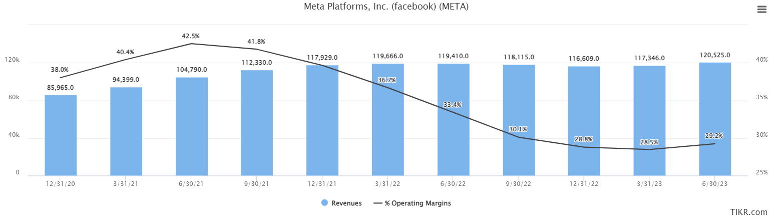 Meta was caught up in pandemic-driven demand for all things digital, as were many other tech companies of all shapes and sizes. That meant profligate spending with a devil-may-care attitude. The problem is that revenue growth essentially stopped, so the company’s profit margins had to shrink. What do you get with a tech company that has flat revenue and falling margins? You get a much lower share price, and that’s what Meta saw in 2022.