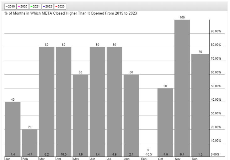One caveat to all of this is that September is a pretty awful month for Meta historically. Below we have five years of seasonality data, and we can see September is far from kind.