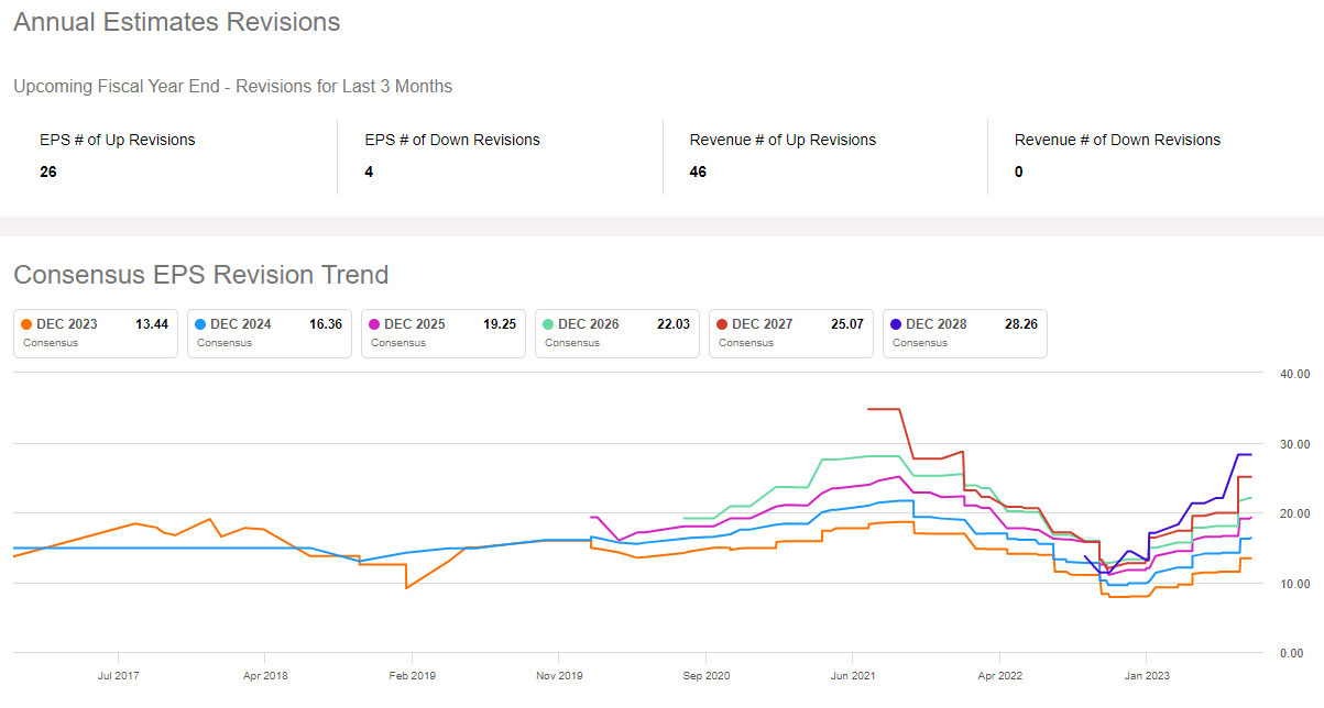 Revenue is expected to rise steadily in the coming years in the area of 11% to 13%, but EPS is set to rise much more quickly. The reason is operating leverage, and that is what is leading to outsized earnings growth estimates. Operating leverage works both ways and it crushed Meta’s earnings a year or two back, but we’re seeing margin reflation due to spending discipline, and it’s just what the doctor ordered.