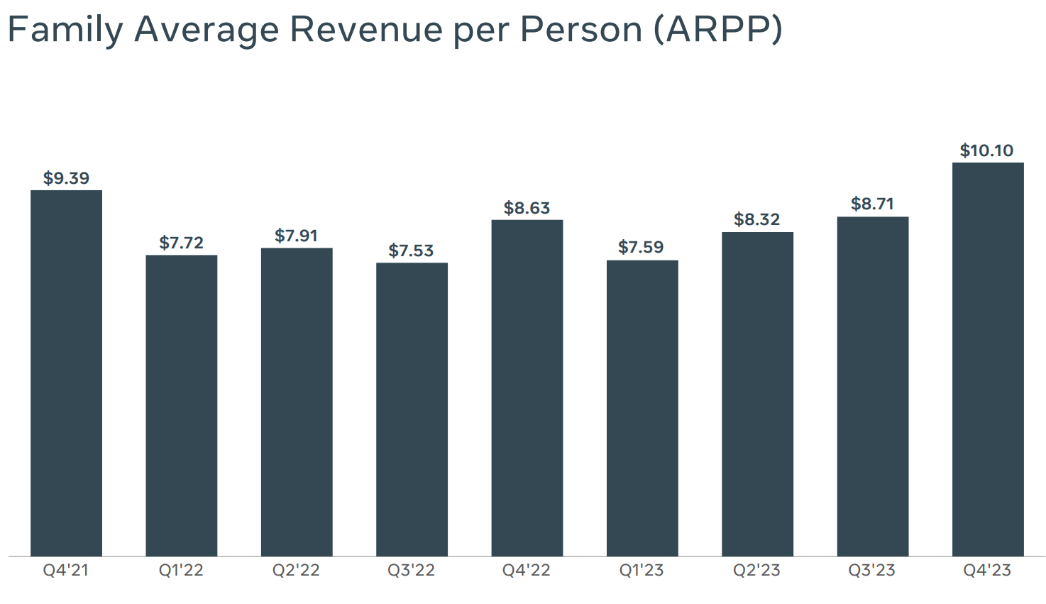 Why is this important? Meta’s strategic plan is to, first, expand the market, and second monetize the market. The key measure of effective monetizing is the family of apps’ average revenue per person ARPP. Meta just reached the highest level in ARPP in the recent quarter at $10.10, and that’s due to the increased use of AI.