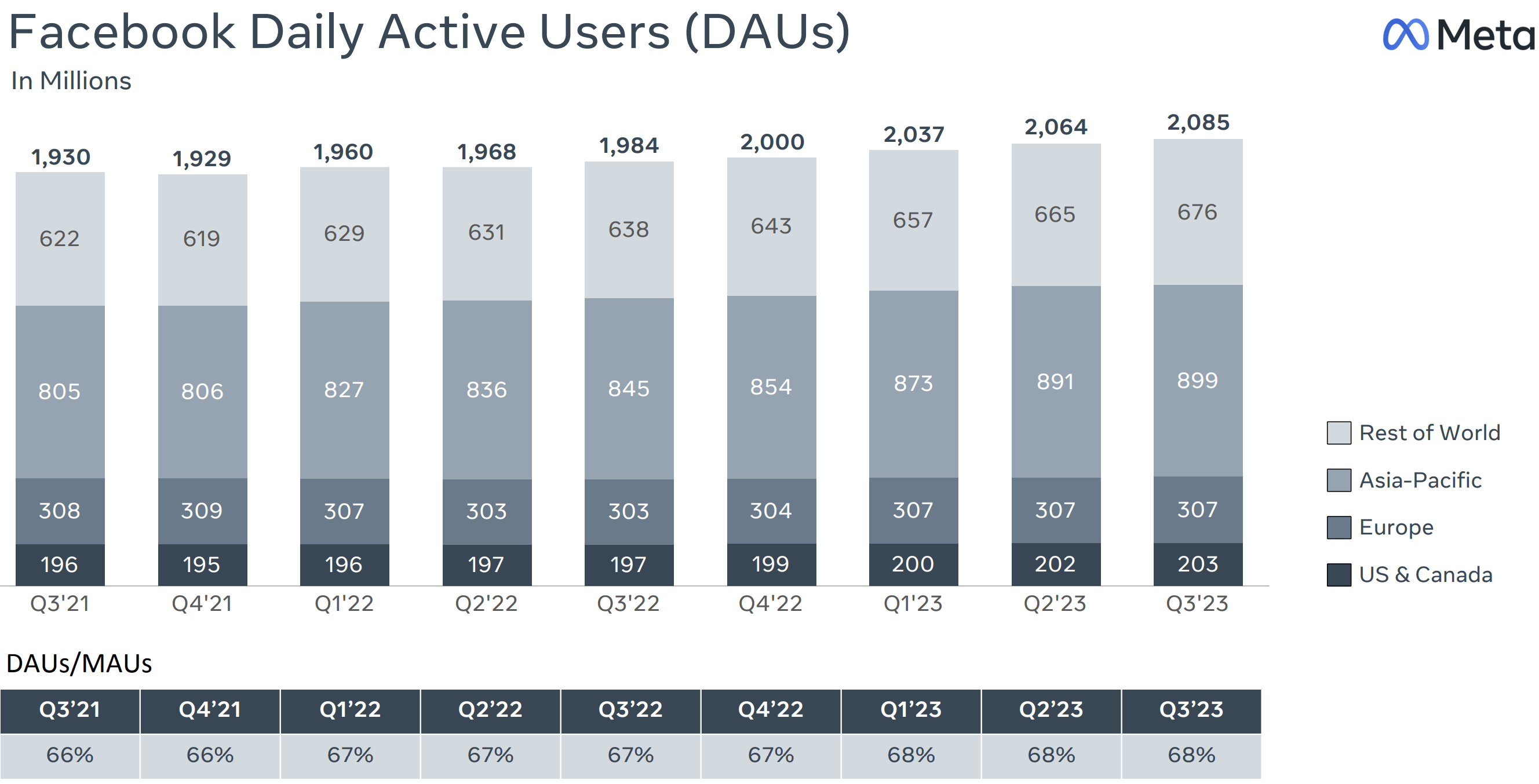 Facebook continues to grow globally and engagement remains strong. Facebook daily active users were 2.09 billion, up 5% or 101 million compared to last year. DAUs represented approximately 68% of the 3.05 billion monthly active users in September. MAUs grew by 91 million or 3% compared to last year.