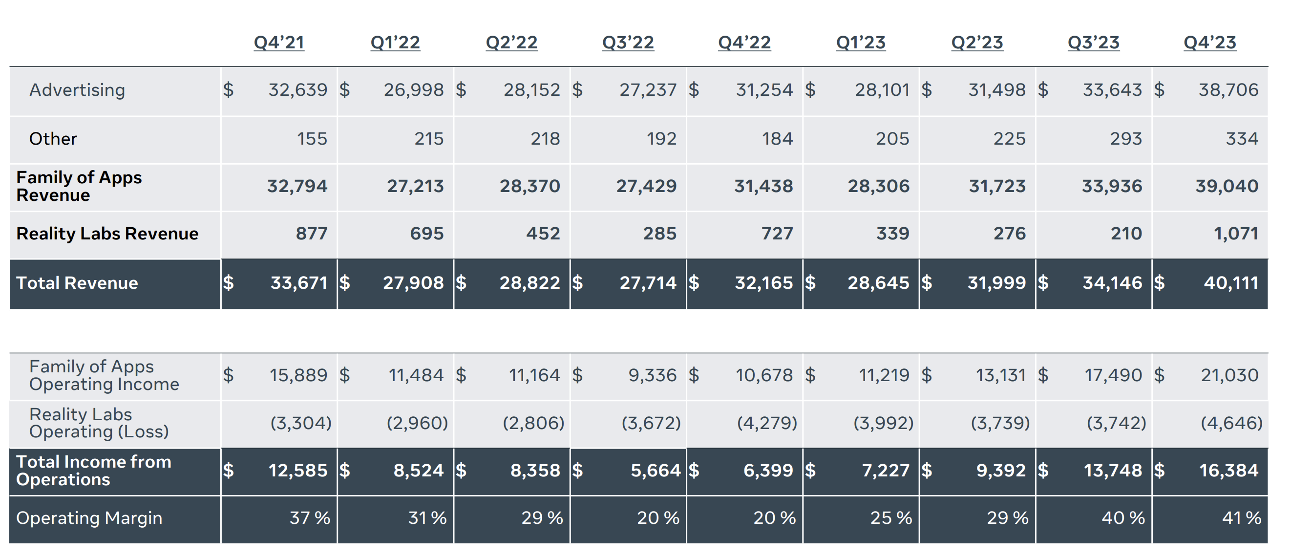 The company had a more than 50% conversion rate to operating income. The company earned more than $20 billion in family of apps operating income, which is double where the company was last year. Given the company’s “year of efficiency” along with fairly fixed expenses, a growth in revenue has led to much faster growth in operating company.