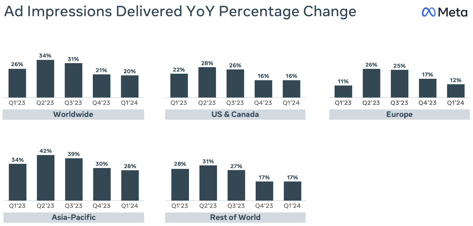 Lastly, large online Chinese retailers, such as Temu and Shein, drive the growth in ad impressions in Asia Pacific. The two have been using Facebook to market their low-cost goods to target American and European customers, making up about 10% of Meta Platform’s total revenue.