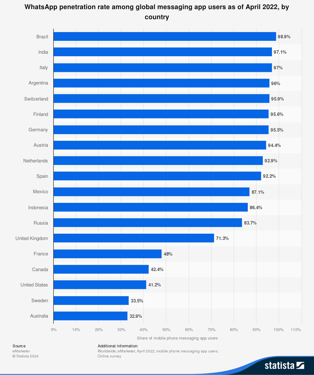WhatsApp penetration rate among global messaging app users as of April 2022, by country (statista.com)