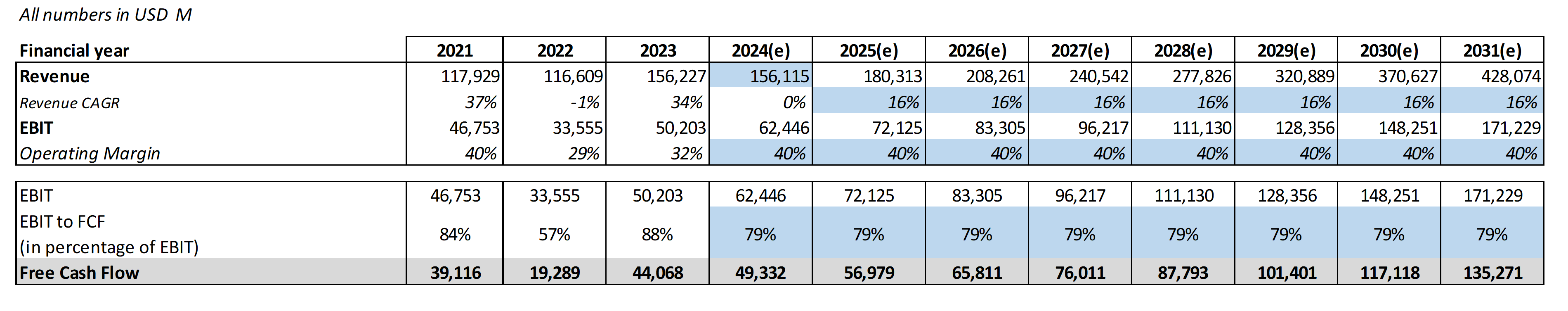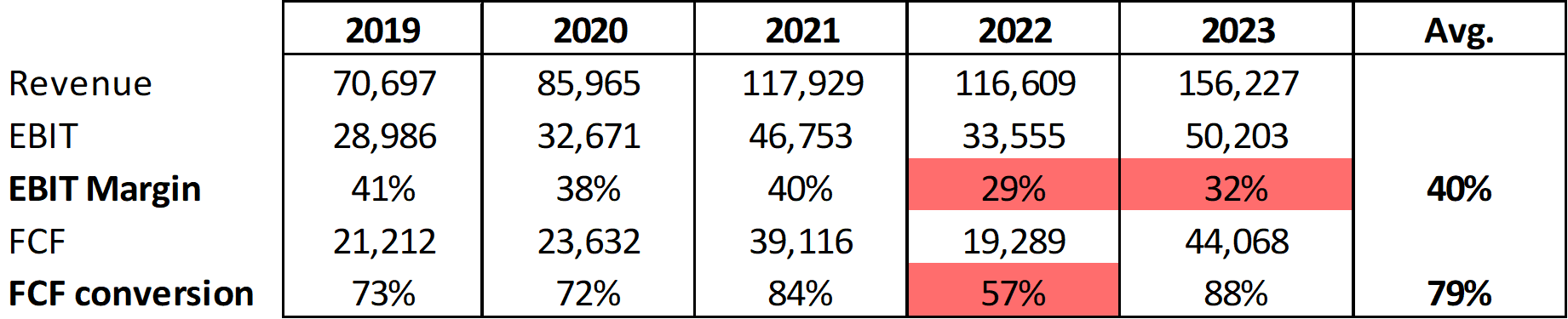 If we take a look at the EBIT margin and the Free Cash Flow conversion of the last few years, these averages seem fitting. The red cells seem like outliers and weren’t considered in calculating the averages.