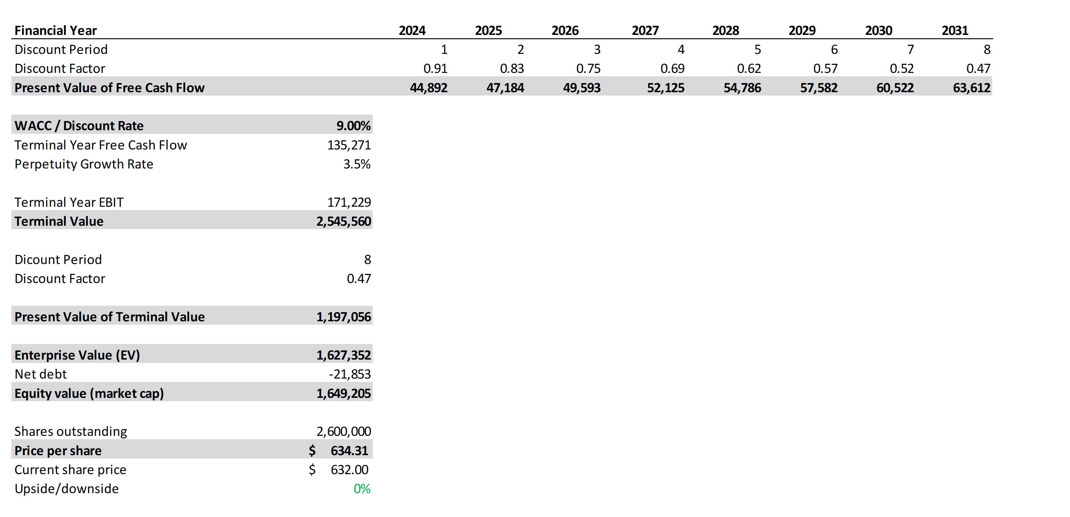 Given these assumptions the company seems to be fairly valued right now, with a fair value share price of $634.
