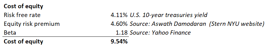 The forward P/E ratio looks good, but for a growth stock, it might be misleading. Therefore, a discounted cash flow (DCF) model must be simulated. I am starting with figuring out the cost of equity, which will be used as a discount rate because I usually rely on the levered free cash flow (FCF). The discount rate is 9.54%, according to the below CAPM working.