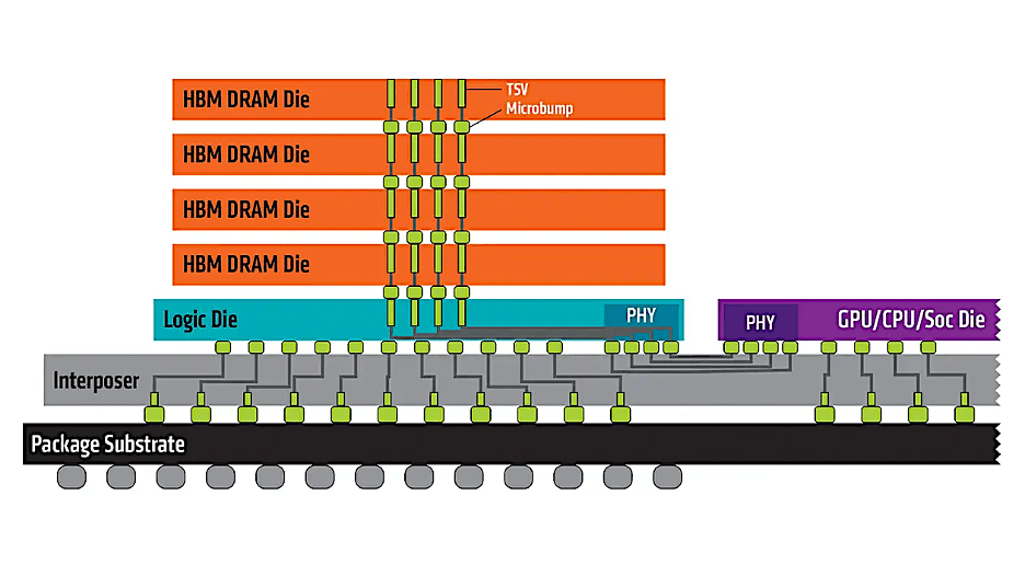 Up to eight DRAM dies are stacked and connected to the memory controller on a GPU or CPU through a substrate, such as a silicon interposer. Within the stack the die are vertically interconnected by through-silicon vias (“TSVs”) and microbumps.