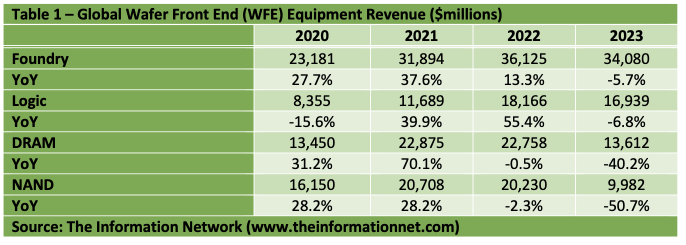For the remainder of CY 2023, Table 1 shows my projection of WFE sales for the sector for DRAMs will drop 40.2% in 2023 while NAND WFE will drop 50.7%, according to our report entitled Global Semiconductor Equipment: Markets, Market Shares and Market Forecasts.