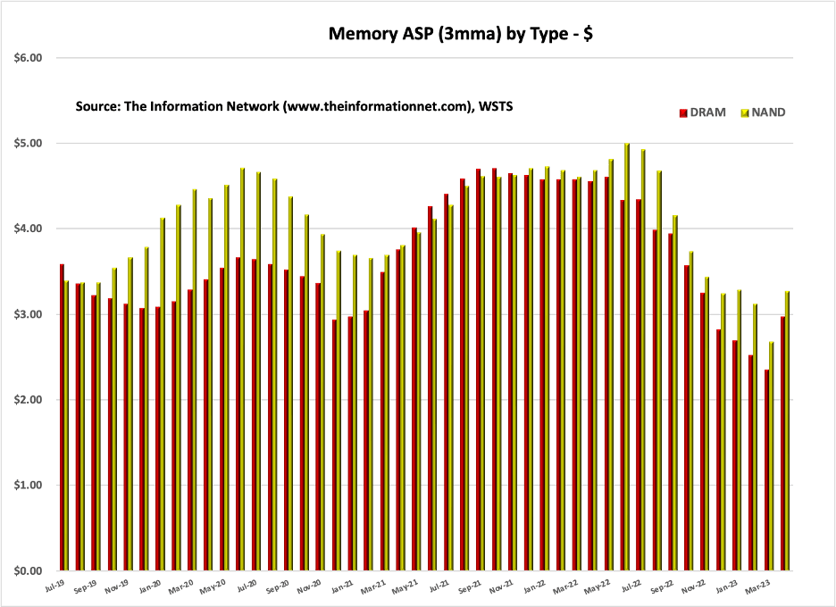 Chart 4 shows SIA reported ASPs for NAND and DRAM between July 2019 and April 2023. Total memory ASPs increased 25.5% MoM (-31.7% YoY), with NAND increasing 22.3% MoM (-30.1% YoY) and DRAM increasing 26.7% MoM (-34.7% YoY).
