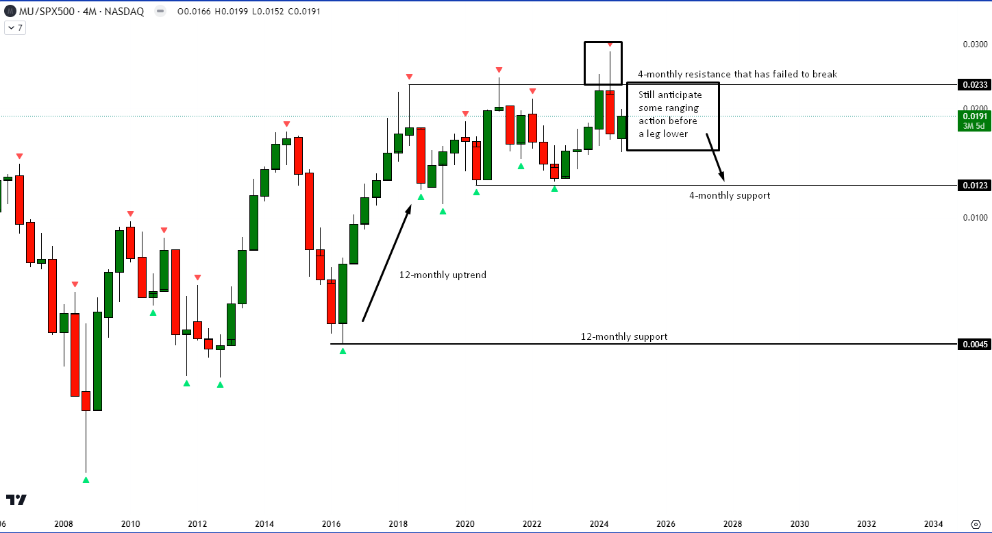 • Despite a positive earnings reaction, the longer-term relative technicals vs the S&P500 point to a range-bound scenario with no clear bullish direction.