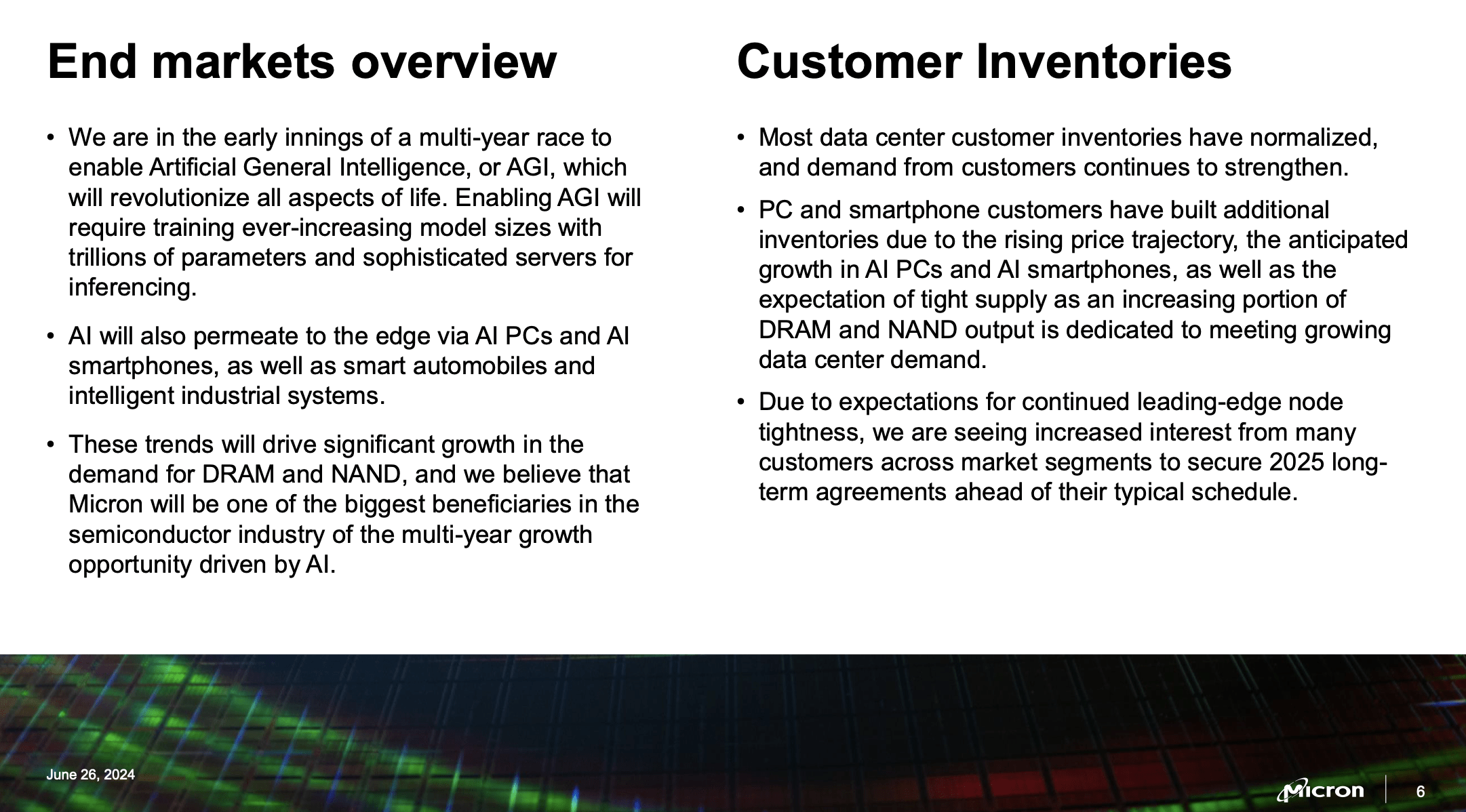 Most data center customer inventories have normalized, and demand from customers continues to strengthen. PC and smartphone customers have built additional inventories due to the rising price trajectory, the anticipated growth in AI PCs and AI smartphones, as well as the expectation of tight supply as an increasing portion of DRAM and NAND output is dedicated to meeting growing data center demand. Due to expectations for continued leading-edge node tightness, we are seeing increased interest from many customers across market segments to secure 2025 long-term agreements ahead of their typical schedule.