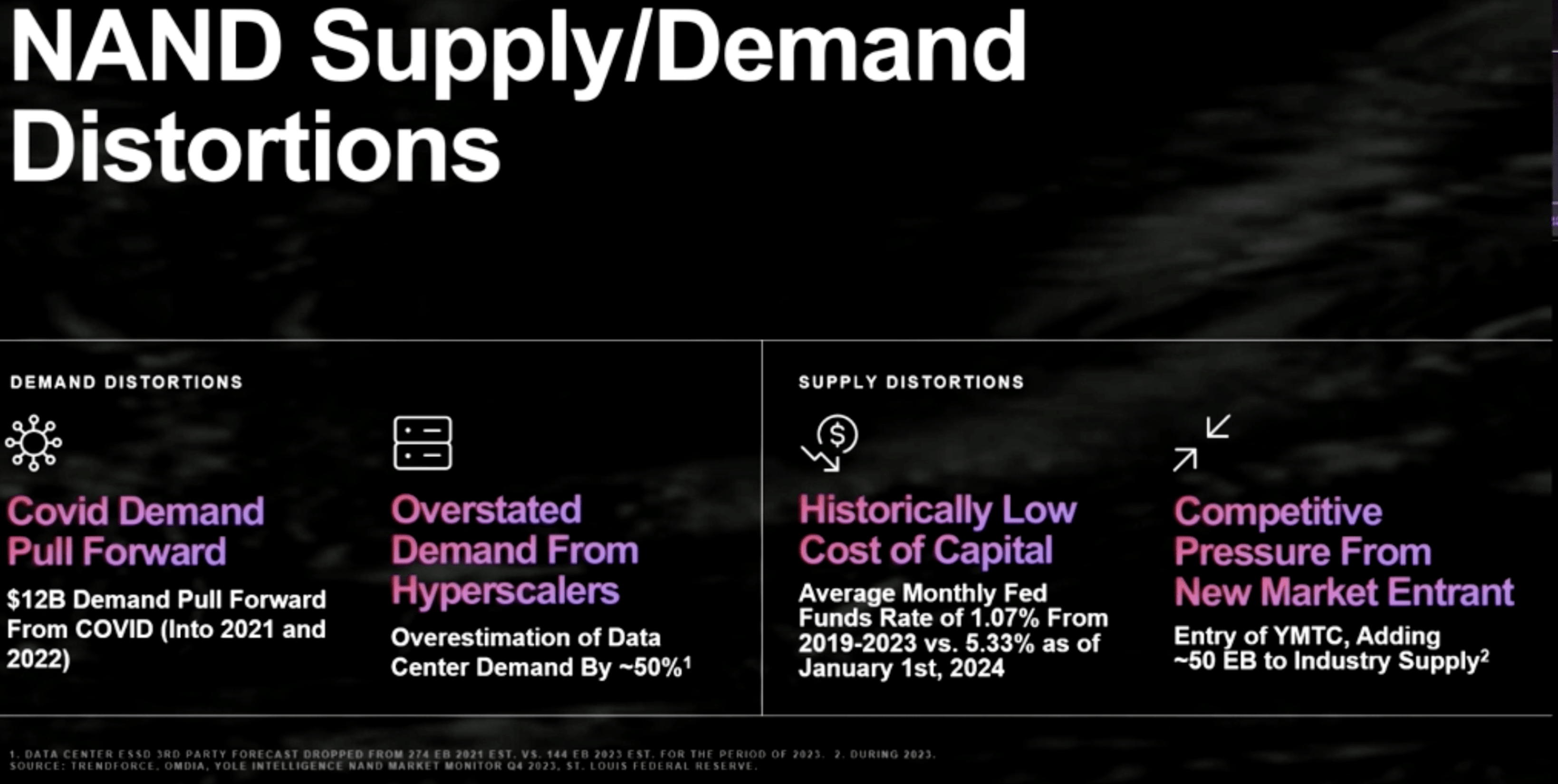 We note that Western Digital just hosted a special investor conference titled the “New Era of NAND,” in which it cited that COVID pulled a lot of datacenter and device investment forward (leaving 2023 a barren year for memory suppliers), coupled with oversupply from the various memory suppliers as interest rates were very low (stimulating investment into capex).