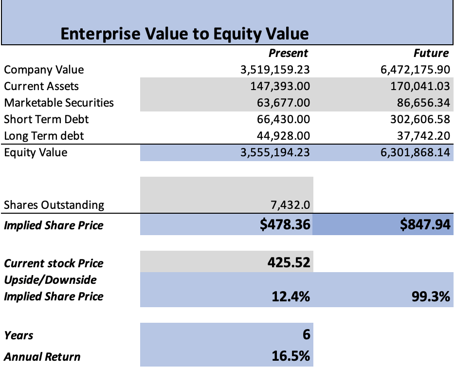 As you can see, the model suggests a present fair price of $397.49, which is 6.6% lower than the current stock price of $425.52. The future price suggested stands at around $701.68, which is a 64.9% upside from the current stock price, however when divided by the number of years in this projection (which is 6), it translates into 10.8% annual returns, which is nearly in-line with the average market performance.