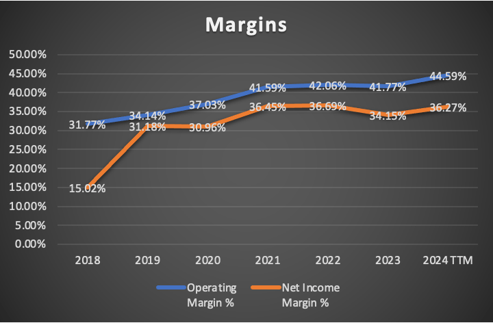 For Microsoft, I will use the average net income margin for 2020-2024TTM of 34.90% to predict net income. During that period Microsoft’s net income margin never went below 30% and for 2021-2024TTM, it never went below 34%.