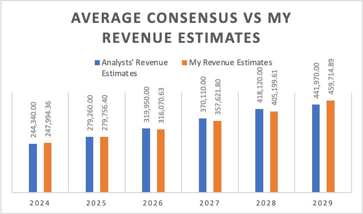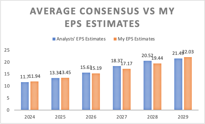 My EPS estimates are over 1.81% lower when compared to the average consensus. For 2024, my EPS target is 2.03% higher, for 2025, that difference narrows to 0.86%, and for 2029, it is 2.54% higher. However, for 2026, 2027, and 2028 they are lower, more specifically, 2.83%, 6.53%, and 5.27% respectively. The reason for this is a mix of my revenue targets, which are 0.36% lower than the average consensus, and net income margins.