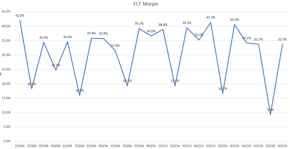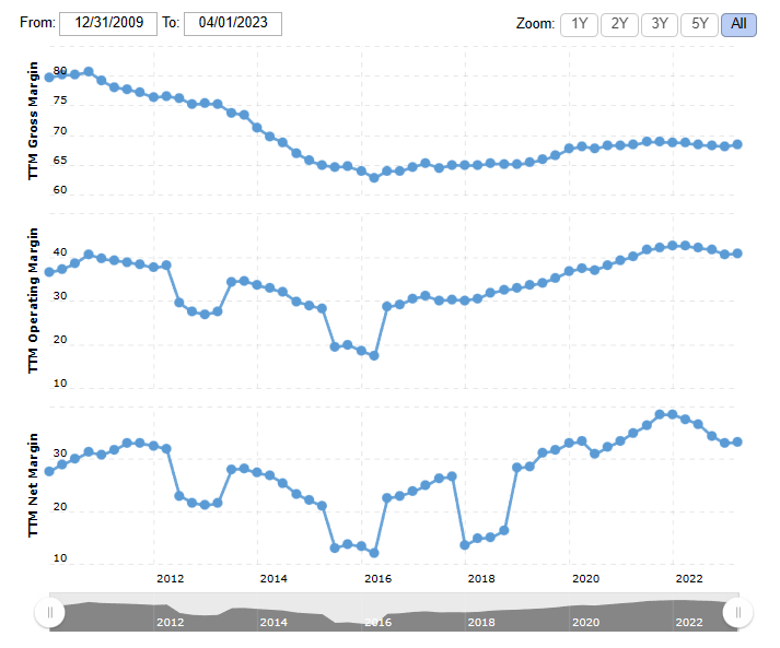 Microsoft (NASDAQ:MSFT), as a big tech company with a market dominance in many areas, has a strong AI strategy that covers the entire software industry. In 2023, they are making announcements along with other companies, showing that generative AI will have a significant impact on enterprise technology. This means it will make interactions easier, automate tasks, and foster greater creativity. I believe the company has many advantages such as data collection, scalability, financial strength, and a strong position in the enterprise market. For example, the company has consistently maintained 30% FCF margin and 40% operating margin on average in the past 3 years.
