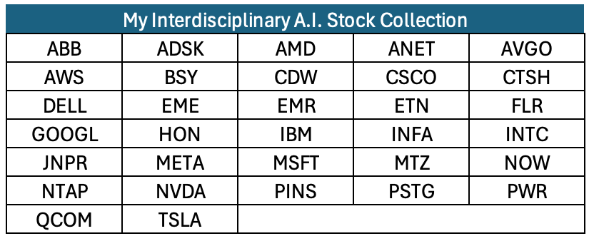 So, I created what I call an A.I. Group. I hand-picked 32 stocks that seem, to me, to be reasonable plays om the progress of AI. It draws from a variety of industries.