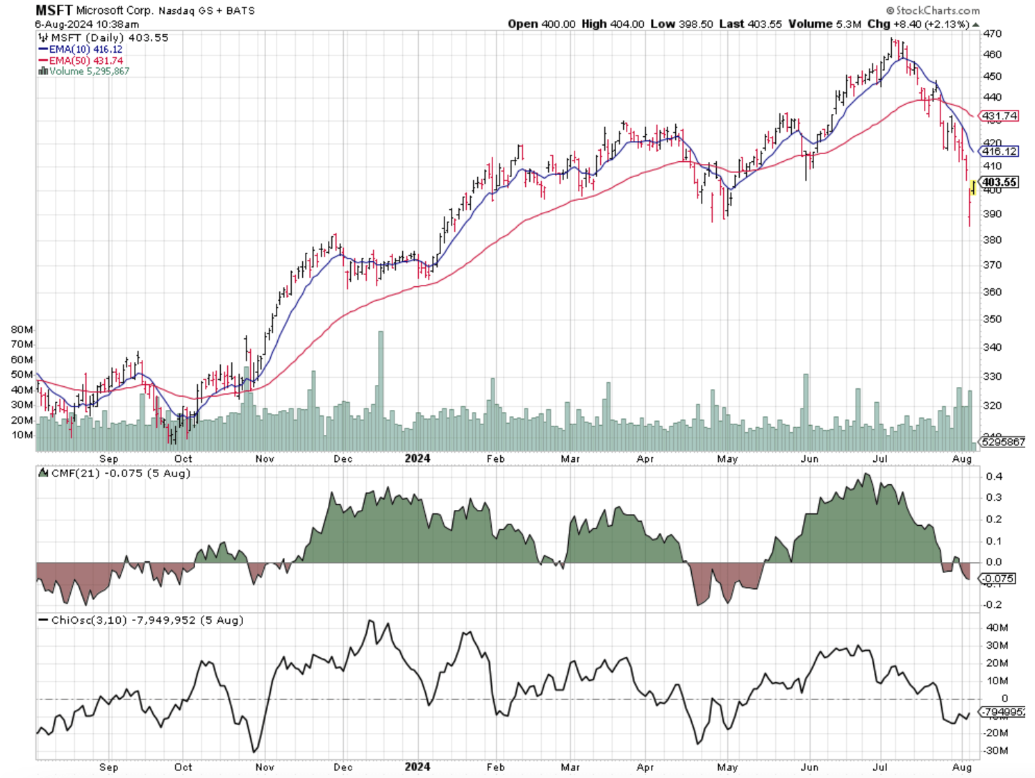 MSFT fares badly under everything I consider. The price tumbled through the 10-day and 50-day exponential moving averages (EMA). And the 10-day went below the 50-day.