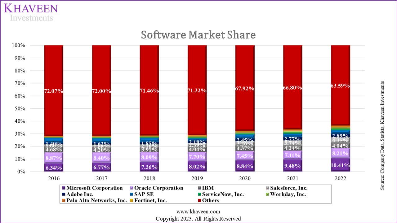 Based on the chart above of the Software market share, Microsoft remained the Software market leader in 2022 with a market share of 10.4% of the Software companies. The company overtook Oracle (ORCL) as the market leader in 2019 as seen in the chart above.
