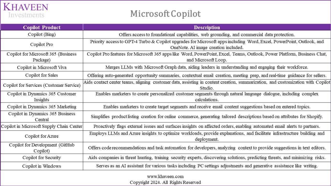 In this section, we examined the Copilot products under each of the 5 revenue segments that have been introduced or are currently still in development. These segments are Office Products, Dynamics, Server Products and Cloud Services, Windows and Search and News Advertising.