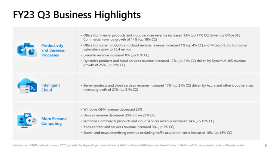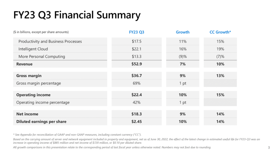 Microsoft is continuing to report great quarterly results. While other companies are already struggling, total revenue for Microsoft increased from $49,360 million in Q3/22 to $52,857 million in Q3/23 – resulting in 7.1% year-over-year growth. In constant currency, revenue increased 10% and although we saw higher growth rates in the last few quarters these are still solid numbers.