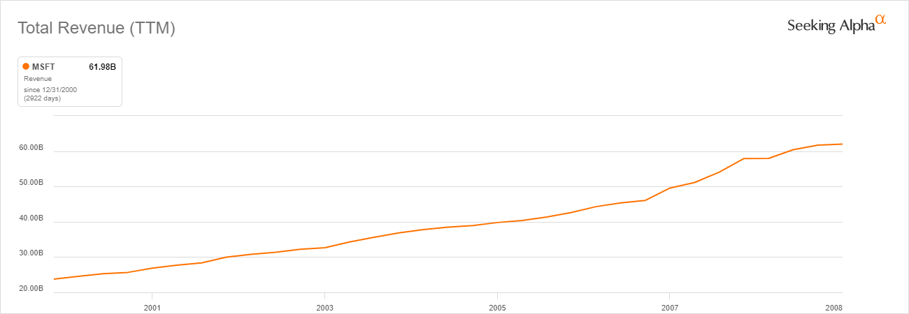 If we use the internet’s adoption as a guide for what MSFT’s future revenues can be we would arrive at a revenue growth rate of 12.72%. The chart below shows from 2001 to 2008 MSFT revenue grew from $23.78 billion to $61.96 billion.