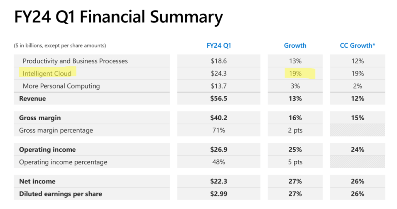 Microsoft has posted great results recently. In the short-term, over fiscal Q1 2024, AI-related momentum has resulted in very strong YoY growth in Cloud and Azure of 24% and 29%, respectively. This has driven overall Cloud revenues up by 19% YoY. Productivity and Business Processes were up 13% YoY, while Personal Computing lagged at just 3% YoY, primarily due to a 22% drop in revenue from Devices.