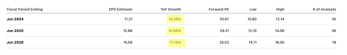 Going forward, it’s likely that growth will continue to be driven by MSFT’s cloud service. The consensus is for annual growth of about 15% until at least 2026. That’s up from about 14% just 6 months ago.