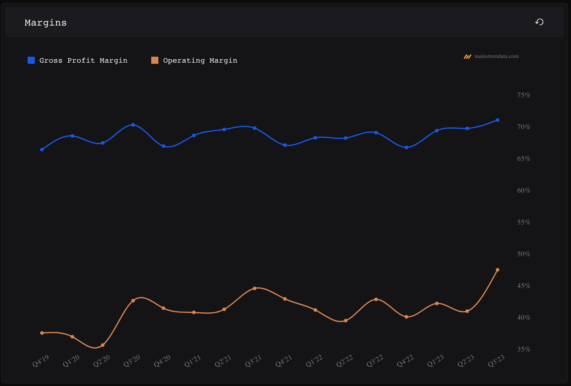Moreover, Microsoft’s margins have continued to improve with the gross margin increasing by 2 pts and the operating margins by 5 pts, reaching record levels.