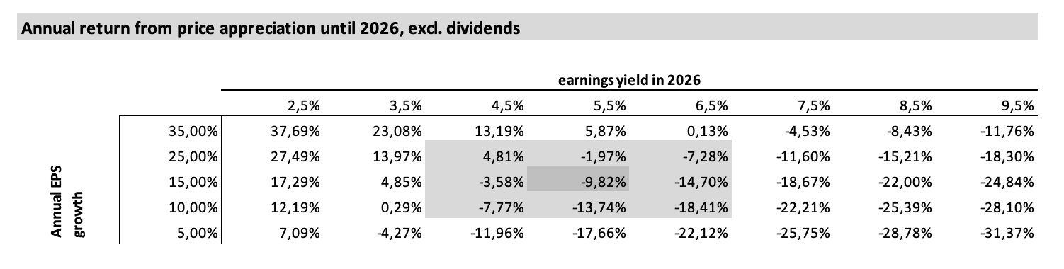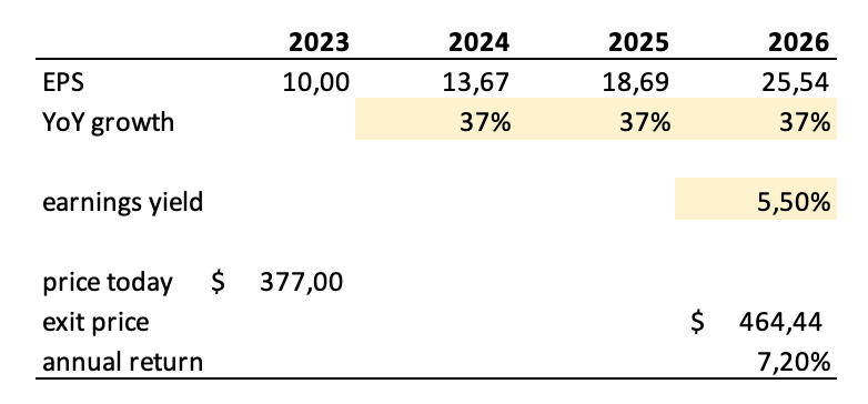 Future growth could easily surpass expectations if AI really takes off, though achieving 37% EPS growth three years in a row is very ambitious, and even then the investment only makes sense if yields decline back to where they were prior to 2022.