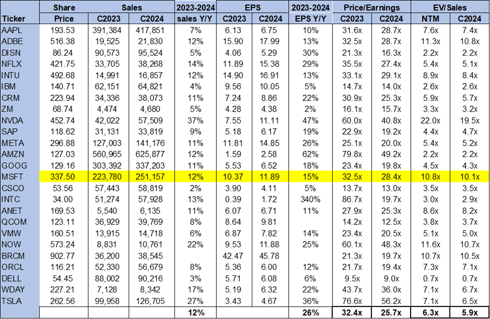 Microsoft is trading well above the peer group at premium multiples; the company hit a record market cap of $2.59T and is now closer to a $2.49T market cap. While we believe Microsoft currently leads the A.I. race in the software/hardware space, we think the stock is too overvalued to provide attractive entry points at current levels, especially considering we won’t see A.I. revenue growth in 2H23. On a P/E basis, the stock is trading at 28.4x C2024 EPS $11.89 compared to the peer group average of 25.7x. The stock is trading at 10.1x EV/C2024 Sales versus the peer group average of 5.9x.