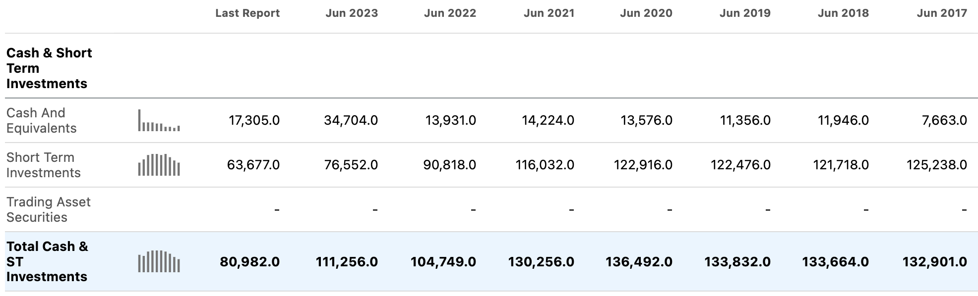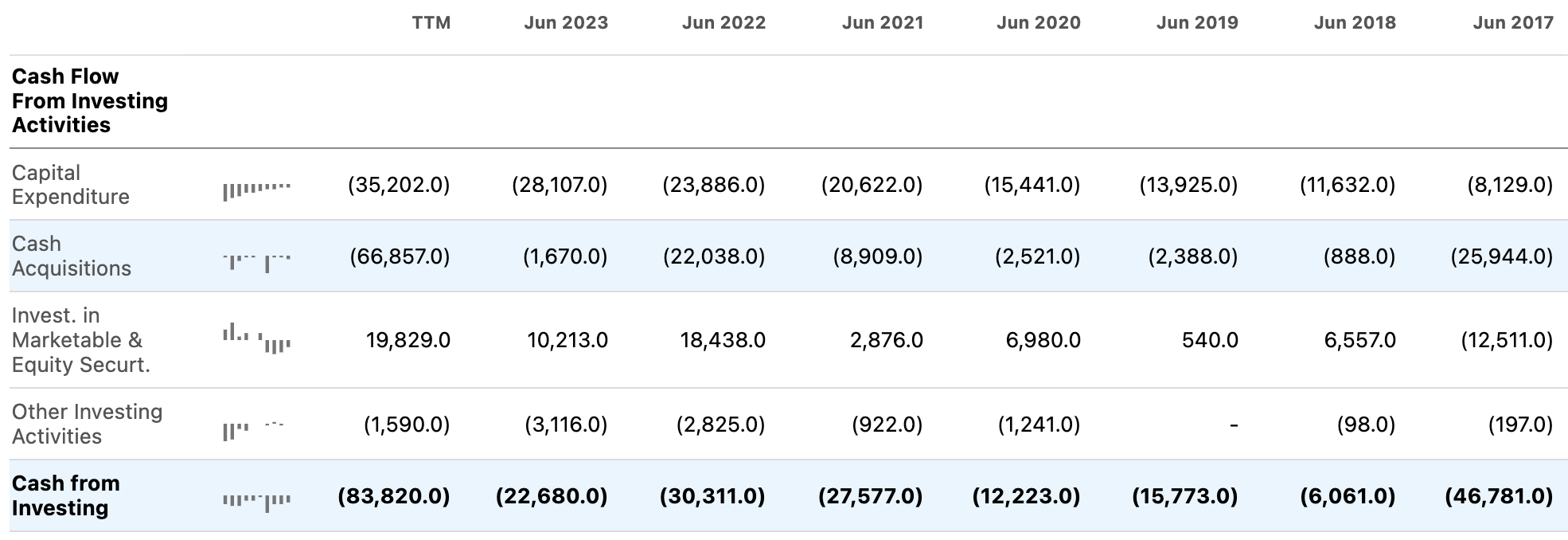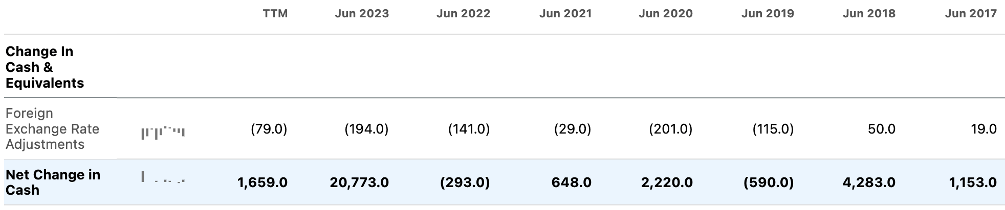 We can see the significant cash acquisition cost on the cash flow statement for the last trailing twelve months, indicating the significant impact on a much lower net change in cash of $1.66 billion in the last twelve months as opposed to in June 2023, when a $20.77 billion net change in cash was reported.