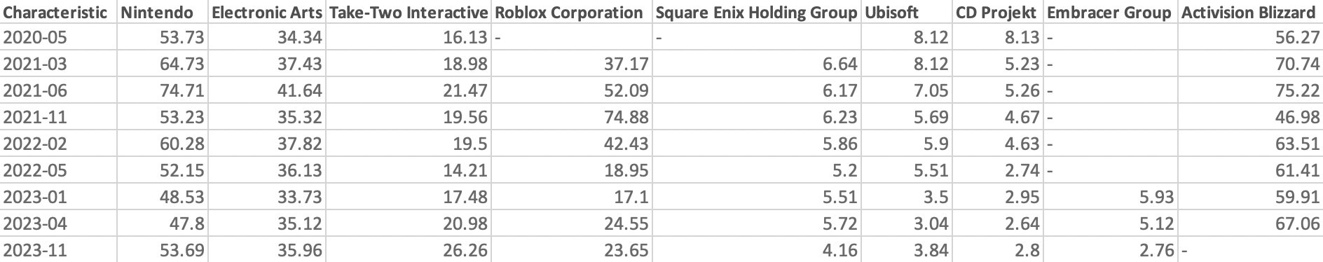 Activision Blizzard’s market cap prior to its acquisition was relatively much higher than all of its major peers. This represents just how significant the acquisition was in strengthening Microsoft’s portfolio and dominance in the gaming industry. In April 2023, Activision’s market cap was around $67 billion, second place went to Nintendo, with a market cap of around $48 billion: