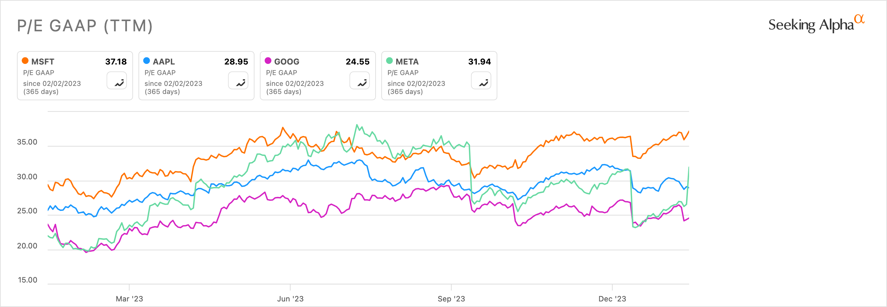 At the time of this writing, Microsoft’s forward P/E GAAP ratio is 35.41, which is 24.49% higher than the sector median of 28.44. I think it is fair to say that the market has modestly overvalued Microsoft shares at this time, but the higher valuation relative to peers is arguably validated by its strong financials. The acquisition of Activision Blizzard only further strengthens Microsoft’s portfolio. If I compare Microsoft to major technology players used to high valuations based on exceptional business models and financial health, its P/E GAAP ratio is still the highest: